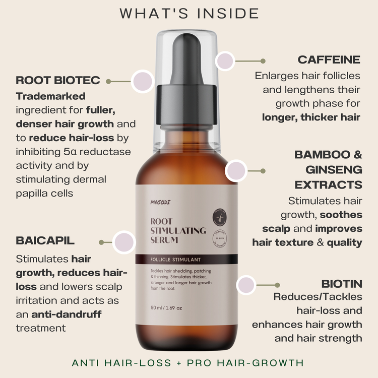 An Anti Hair-Loss and Pro Hair-Growth Scalp Serum that contains Trademarked ingredients such as Root Biotec, Baicapil, Biotin, Caffeine and a wide range of Natural Extracts to fight hair-loss, thinning hair and patches while stimulating the hair follicle to produce thicker, longer, stronger and healthier Hair and Hairline. No harsh side-effects. Suitable for use during pregnancy/breastfeeding. No risk of Hair-Loss when you stop using the Serum