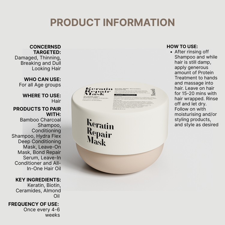 High-performance keratin mask formulated to repair and strengthen weak, damaged and dull hair. Penetrates deeply to rebuild protein bonds, reduce breakage, smooth out hair texture for better manageability, and improve overall hair look and shine